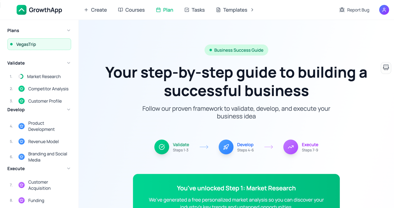 GrowthApp isn’t another blank tool or AI chatbot. It’s a structured system built to take you from idea → first customer with clarity and momentum.
